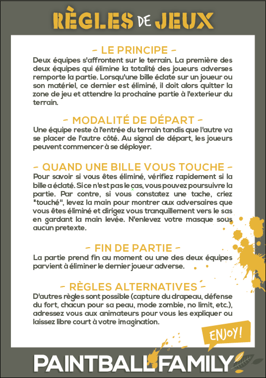 Le personnel peut refuser l’accès à l’activité Paintball s’il estime que le participant n’est pas apte physiquement à la pratique du paintball.